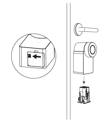 - Le compartiment des piles se trouve en dessous de la serrure Smart Lock. Pour l’ouvrir poussez le petit levier en direction de la flèche et ôtez le compartiment des piles de la Smart Lock.